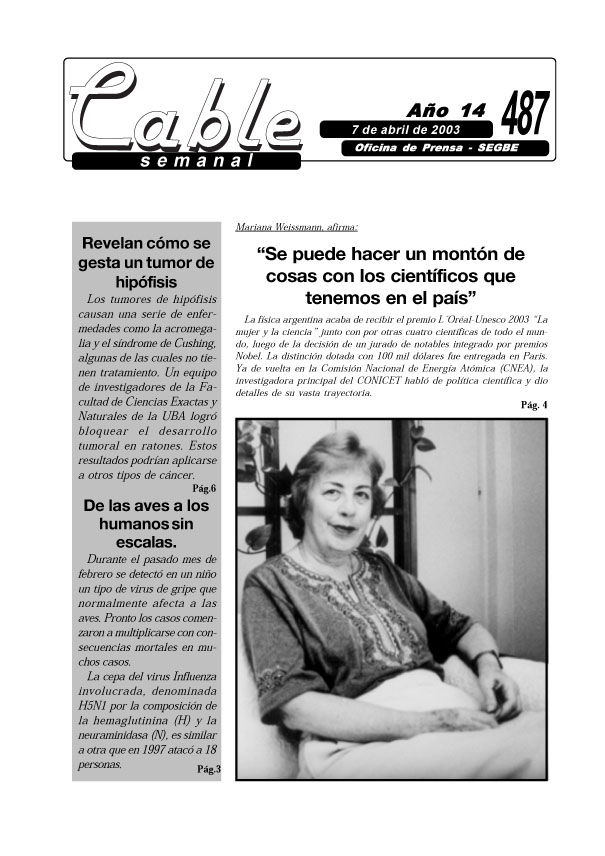 La física argentina acaba de recibir el premio L´Oréal-Unesco 2003 “La mujer y la ciencia” junto con por otras cuatro científicas de todo el mundo, luego de la decisión de un jurado de notables integrado por premios Nobel. La distinción dotada con 100 mil dólares fue entregada en Paris. Ya de vuelta en la Comisión Nacional de Energía Atómica (CNEA), la investigadora principal del CONICET habló de política científica y dio detalles de su vasta trayectoria.